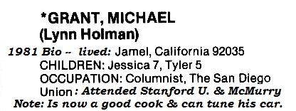 ********************* Michael has lived in San Diego East County since he arrived from Texas in 1972. He worked at The San Diego Union for 20 years—as a reporter, editor and columnist. In 1990, he became journalism and media instructor at Grossmont College, where he taught and wrote stories for Grossmont's newsletter, Campus Scene. He has authored several books, including Warbirds—How They Played the Game and Michael Grant's Cookbook. He operated an online writing service, The Write Outsource, at writeoutsource.com, and he is at work on two books, one about media literacy, the other a novel. He and his wife, Karen—herself a writer and also a lawyer—live in southeast unincorporated La Mesa. Grant is presently in the 62nd grade. He is a member of the 1961 graduating class at Abilene High School, and of the class of 1965 at Stanford University. Also important to his education were three years in the U.S. Army, 1966-69. He was an artillery officer and did not have to go to Vietnam. Three quotes important to his work: Grant has won several awards for his work, but none to match the achievement of his son, Tyler Grant, who is the 2008 National Flatpicking Guitar champion. Source: (www.patch.com/users/michael-grant-2) ********************* Mike graduated from the 12th grade with the 1961 class of Abilene High School (Texas), as "Michael Grant WAYMAN". On 22 Jul 2019, Grant graduated from the 70th grade and was elevated to a better place. He leaves behind his 4th wife Karen, his son Tyler Grant, daughter, Jessie Bell and several others. |