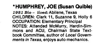 I think back about how I spent my summers during this time. Little League baseball was at the top of the list. I played in the Key City Little League for the McIlwain Ford Thunderbirds from age 8 to 12. Summer mornings found me headed to the Fair Park recreation center for games of pool, ping pong, darts, dodge ball, etc. I would normally be accompanied by Jackie Harrison who lived on South 11th and Barrow Streets (actually one house off Barrow, I believe). Weekends were consumed by baseball games, trips to Abilene State Park and the freezing waters of its swimming pool and the special trips to the swimming hole in Cisco below the big dam. |