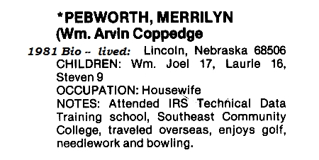 | Merilyn PEBWORTH | Sharon TERBUSH | Linda WRIGHT |