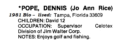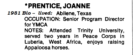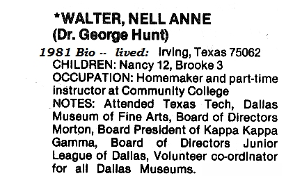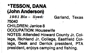 Ann was a senor transfer from Corpus Christi, TX. Her father was an Optometrist for Texas State Optical and he and Ann moved to Abilene, in 1960 leaving the rest of the family in Corpus Christi for a few months. Ann was an ardent supporter of John F. Kennedy and worked hard in the 1960 Presidential campaign. The family returned to Corpus Christi and she later married Col. Gerald Hipp. |