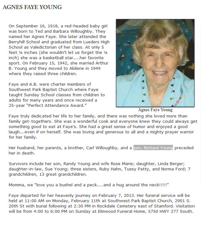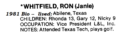~~~~~~~~~~~~~~~~~~~~~~~~~~~~~~~~~~ Linda and Ed Rister divorced after the birth of three sons and more than 20 years of marriage, in 1982. Later in 1984, she married Ronald E. Riley. Sadly, Linda passed away on 15 May 1989 in a hospital in Fort Worth. |