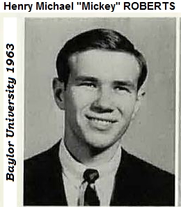 Roberts, Henry Michael "Mickey" [18 Sep 1942 - 1 May 2003 of heart failure] Henry Michael "Mickey" Roberts, age 60, passed away on May 1, 2003, in Dallas. He will be buried on May 4 alongside his son, John M. Roberts, at Sparkman Hillcrest Memorial Park, Dallas. Henry was born on September 18, 1942, in Abilene, TX, to parents Cecil M. and Irene Roberts. After graduating from Abilene High School in 1961, he entered Baylor University. Henry was very active in First Baptist Church, Abilene during high school and later while attending Baylor. Henry married Suzanne Barker, of Abilene, on December 27, 1964, at the First Baptist Church, Abilene. He is survived by his wife, Suzanne, of Dallas among others. Henry was preceded in death by his parents, and a son, John Michael in 1994. |