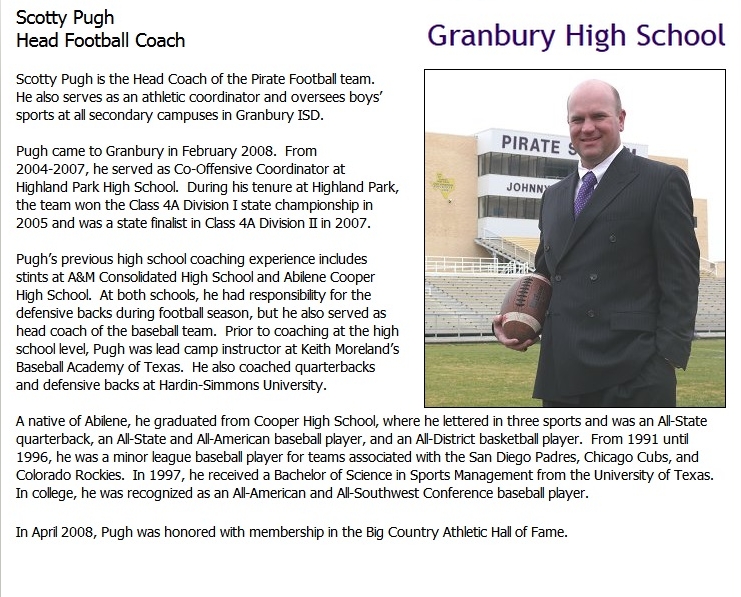 Update on Scotty Pugh, son of Kirby Pugh. Outstanding 3 sport athlete at Cooper High School, Class of '88, named to the Big Country Athletic Hall of Fame video. Head Coach of Grandbury High 1998 to present. |